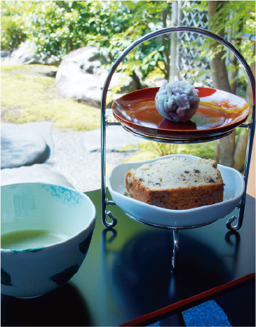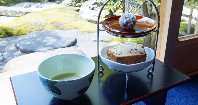 お寺が営む珍しいカフェ。四季の庭園を眺めながら、和菓子や洋菓子、抹茶で心に一服できる癒しの空間。