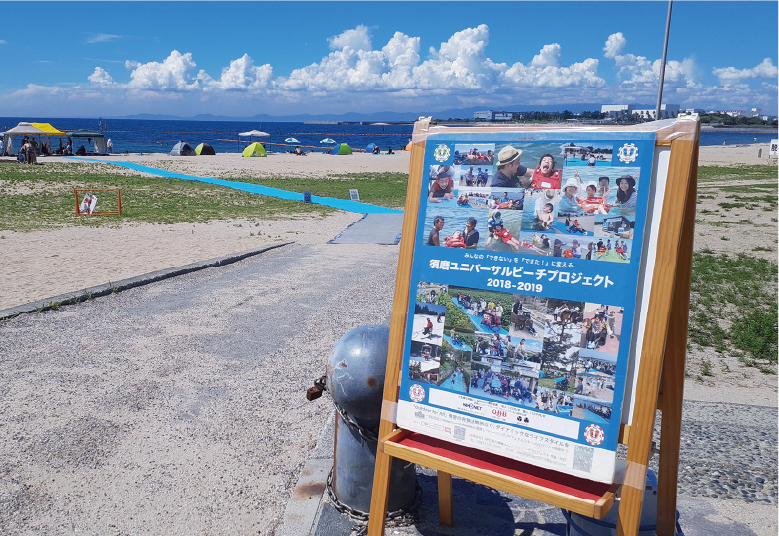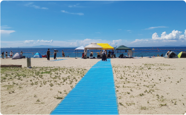 誰もが楽しめるやさしいビーチを目指して、国際環境認証「ブルーフラッグ」を取得した二色の浜海水浴場で、ビーチマットの設置と水陸両用車イスを用いて海水浴を楽しむユニバーサルビーチ体験会を、NPO法人須磨ユニバーサルビーチプロジェクトと二色の浜魅力向上推進協議会との共催で実施しました。